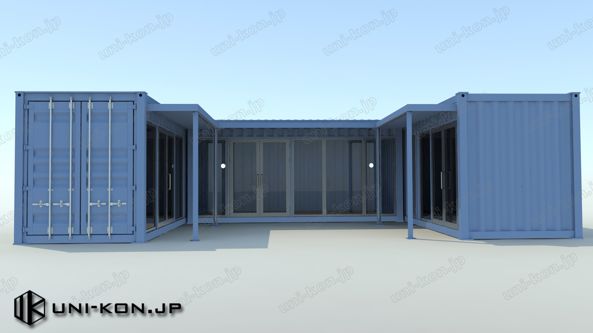 規格:長辺排水勾配屋根20HCコンテナx6台(「コ」型配列3連棟x2棟)+「コ」型縁側庇x2式